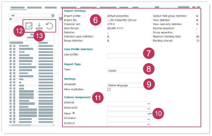 Wörterbucheinträge per CSV-Import erstellen, Handlungsschritte 6-13